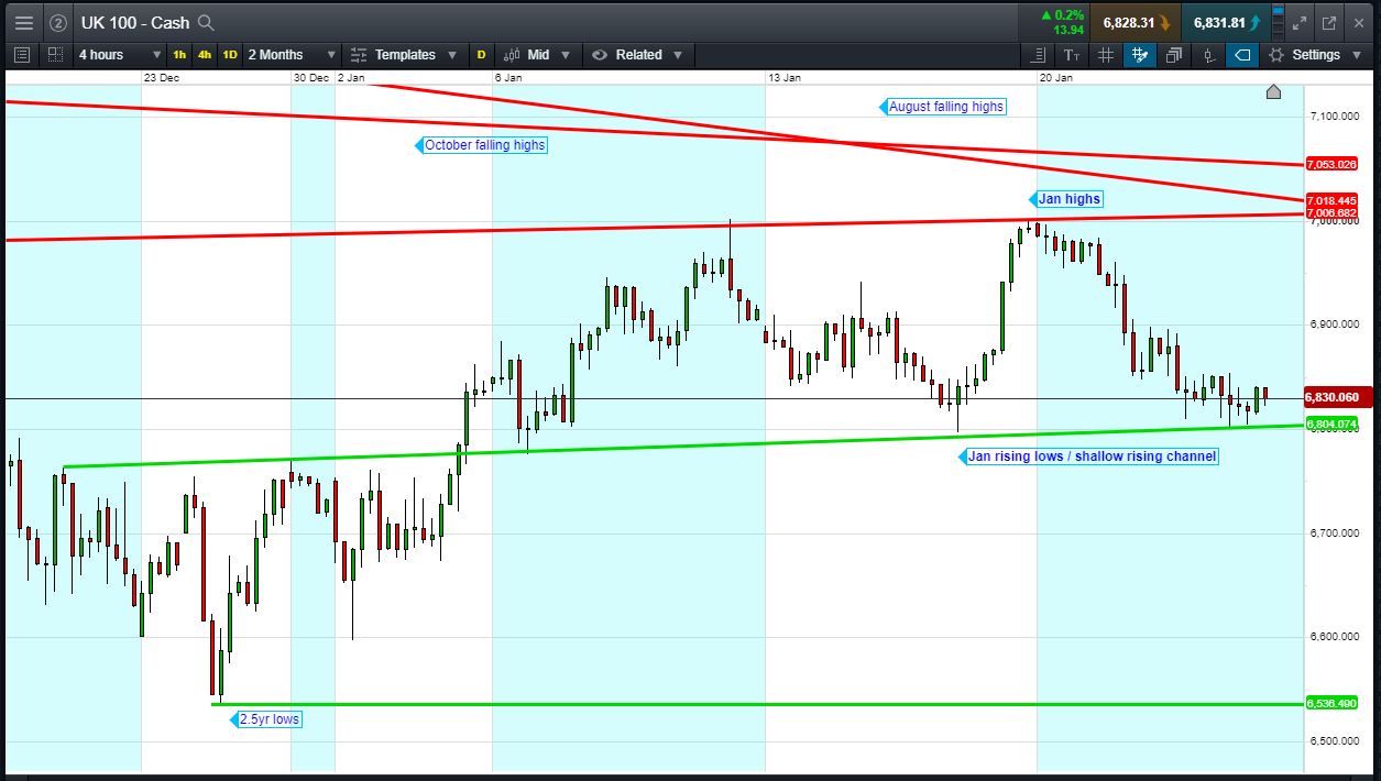 UK 100 called to open +10pts at 6830, extending its bounce from the floor of its shallow 6800-7000 rising channel. Bulls need a break above 6850 2-day support-turned resistance. Bears require a breach of the 6800 channel floor. Watch levels: Bullish 6855, Bearish 6795