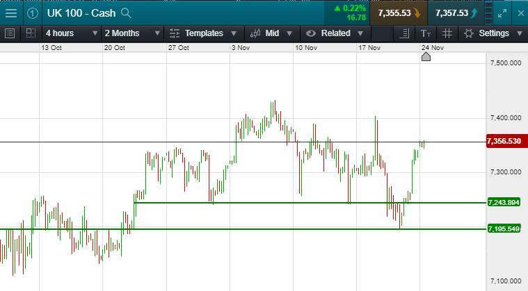UK 100 called to open +30 points at 7256; This come on the back of a positive trading session in Asia thanks to a surprise victory in Hong Kong for pro democracy candidates after a record turnout to vote. The Hang Seng lead Asian markets higher +418 points, the Nikkei also closed higher +181 points, how much of this positive sentiment will filter through to European markets today? Focus on mining stocks this morning. The US closed out last week on a high, the Dow +103 points on Friday, the S&P closed +7 points and the Nasdaq completed the green sweep +13 points. Crude continued to push higher, trading at $63.7 at time of writing while the biggest loser from this positive sentiment is Gold trading down at $1459.