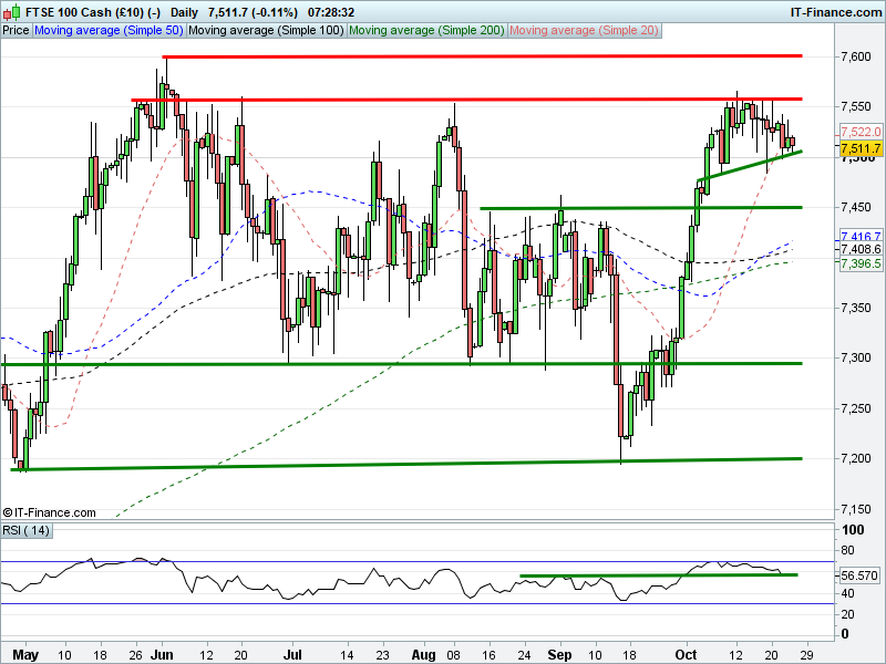 UK 100 Index called to open -15pts at 7510 after easing further from yesterday’s highs, to maintain the trend of falling highs since Friday, but stopping short of testing round number 7500. Bulls need a break above falling highs resistance at 7530. Bears will be hoping for a test of support at 7500. Watch levels: Bullish 7530, Bearish 7500.