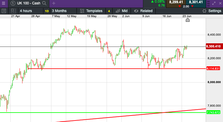The UK 100 called to open +19 points at 8,301.  The UK 100 looks set to open higher today, continuing on from yesterdays strong showing for the UK's blue-chip index.  On Wall Street yesterday it was a mixed session, the Dow Jones Industrial Average climbed Monday as investors sold big technology names in favour of other sectors such as banks and energy.  The Dow advanced 260.88 points, or 0.67%, to close at 39,411.21. The S&P slid 0.31% to 5,447.87, while the tech-heavy Nasdaq declined 1.09% to 17,496.82. It was the worst day since April for the Nasdaq.