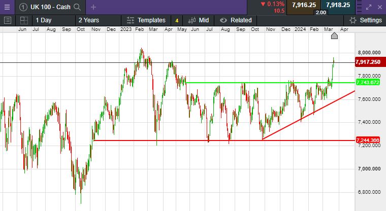 The UK 100 called to open -10 points at 7,920. The UK 100 looks set to open lower this morning, this comes on the back of a strong showing last week, the UK’s Blue-chip index adding 2.6%, as global markets gained traction by the apparent hope of interest rate cuts. On Wall Street Friday, The Dow Jones dropped, but still managed to deliver its best week of the year after back-to-back record-setting sessions. The Dow dipped 305.47 points, or 0.77%, to close at 39,475.90. The S&P also edged lower, but, by just 0.14% to end at 5,234.18. The Nasdaq outperformed and added 0.16% and closed at 16,428.82 for another record.