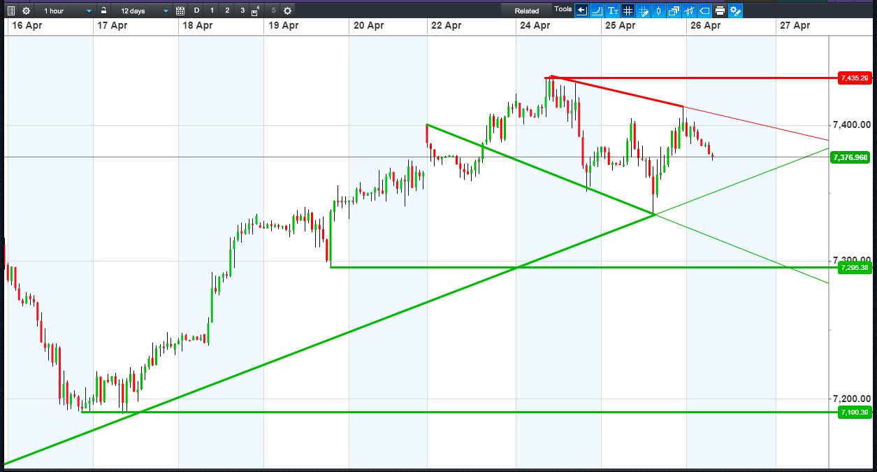 UK 100 Index called to open -5pts at 7375, having pulled back from another overnight attempt to crack 7400. Bulls need a break above 7405 to clear 2-day falling highs. Bears require a breach of rising support at 7350 to extend a 3-day falling channel. Watch levels: Bullish 7405, Bearish 7350