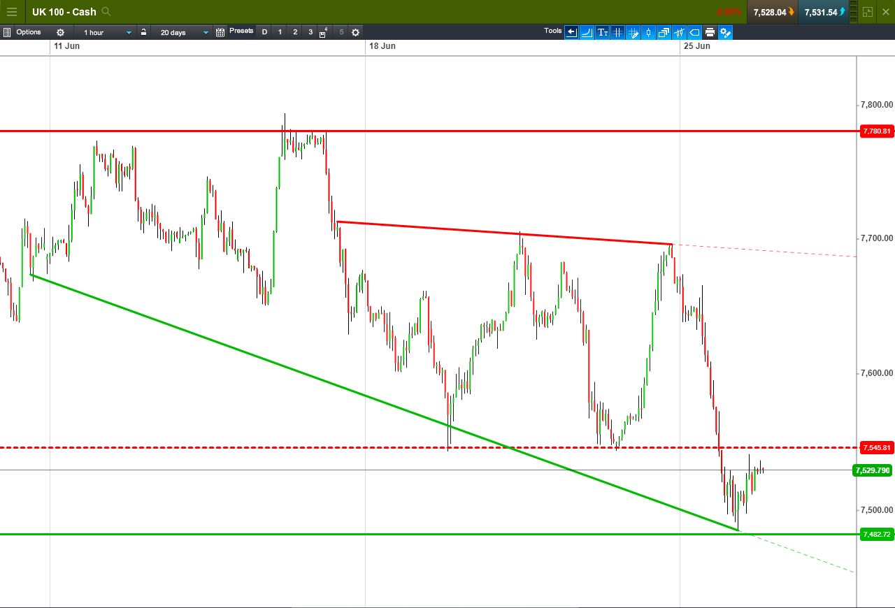 UK 100 Index called to open +20pts at 7530, off Monday lows but yet to break back above yesterday’s 7545 breakdown, which would open the door for a recovery of the recent 2.7% sell-off from 7690. Bulls need a break above 7545 support-turned-resistance; Bears require a breach of rising overnight support at 7525. Watch levels: Bullish 7545, Bearish 7525