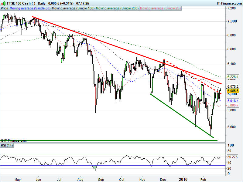 UK 100 Index called to open +55pts at 6065, in the midst of testing Monday’s highs as the rally from Wednesday’s lows extends, allowing for a tentative breakout from a 3-month downtrend, the ceiling of which has dogged the index of late. We do, however, point to the more significant hurdle in with 9-month falling resistance around 6130 which coincides with end-Jan highs. Only once this is bettered can we look further north. Watch levels: Bullish 6100, Bearish 6040