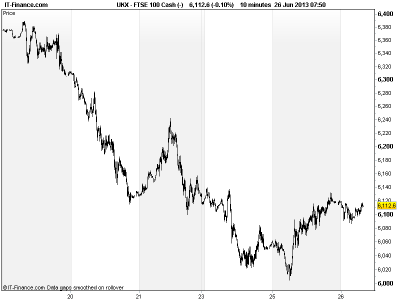 Still lots of dovish tones from central bank officials (ECB, BoE) that normalisation of monetary  policy is a way off yet and that markets have over-reacted to the Fed comments about tapering and end of QE3 with much focus on demand still being weak and any timetable being data-dependent and thus subject to change. Does this signal that the desired market correction has been delivered?