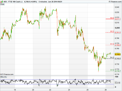 UK 100 called to open up +13pts at 6752, having shed 53pts yesterday on escalating violence in the Middle East.