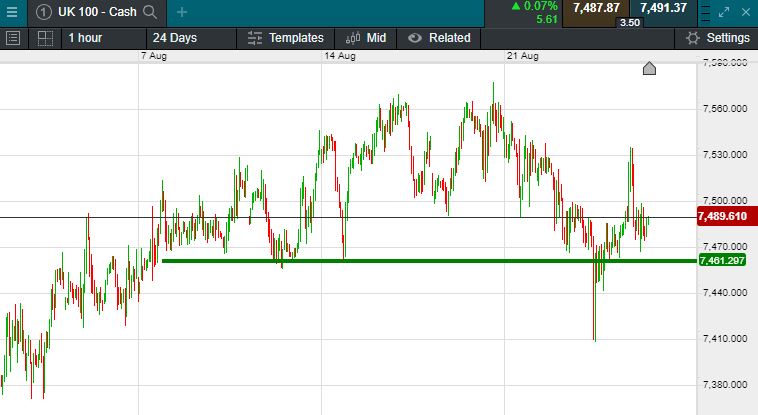 The UK 100 is called to open +25 points this morning at 7504.  The UK 100 looks set to open modestly higher this morning with investors awaiting Federal Reserve chair Jerome Powell’s Jackson Hole speech on Friday and reacting to news of another increase in the energy price cap in the UK.  This follows gains in the US and Asia overnight, At the close, the Dow was up 324 points, or 1%, at 33,292 points.   Meanwhile, The S&P gained 1.4% to close at 4,199 and the Nasdaq advanced 1.7%, finishing at 12,639.