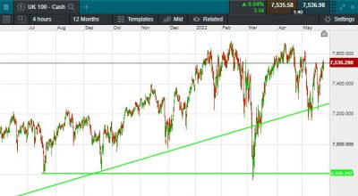 The UK 100 is called to open -15 points this morning at 7505.  The UK 100 looks set to set to open lower on a day likely to be dominated by politics and the cost of living.  This comes despite US markets closing higher yesterday after the minutes from the latest meeting of the Fed.  The BBC reported this morning that the Chancellor looks set to unveil a £10bn package to help those struggling with soaring energy bills.  Rishi Sunak is set to scrap his previous energy loans scheme and give people a one-off grant of up to £400 instead, with the more vulnerable also receiving a VAT cut and additional help.  It will be paid for by a windfall tax on oil, gas and power firms to raise £7bn.  Asian shares were mostly lower on Thursday after the Bank of Korea announced a 25 basis points hike in its base rate to 1.75%, the central bank’s second straight rate increase.  Japan's Nikkei 225 slipped 0.17% and South Korea’s Kospi dipped 0.27%.  The Shanghai Composite in China traded 0.72% higher while Hong Kong’s Hang Seng index fell 0.62%.