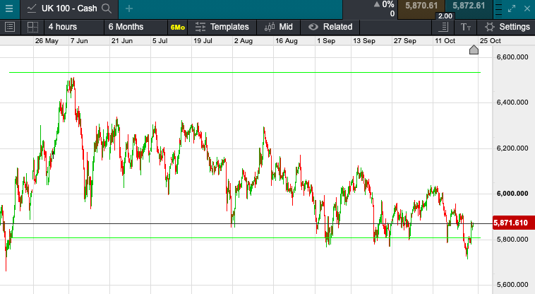 UK 100 called to open -50 points this morning at 5810. Calls for a negative open come amid fading hopes a stimulus bill will be signed this side of next week’s election and against a backdrop of a third record day for coronavirus infections. In Asia stocks were mostly lower today as new COVID-19 cases continue to rise in the US and across Europe. In China, the Shanghai composite was down 0.88% while Japan’s Nikkei 225 dipped 0.06%. Shares in Hong Kong skipped the trend with the Hang Seng index rising 0.54%.