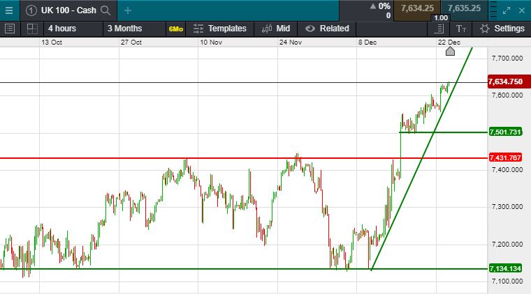 UK 100 called to open +7 points at 7632; This comes as a global benchmark for stocks hit a fresh record high on Friday in holiday-thinned trading, boosted again by the tech sector that’s made 2019 a year to remember for risk assets. Hong Kong and Taiwan shares outperformed in Asia at the end of the week.  The Dow Jones closed at 28,621 (+105 points) before the Christmas break, the S&P closed at 3,239 (+16 points) & the Nasdaq 9,022 (+69 points).  The Nikkei closed at 23,837 (-87 points), whilst the Hang Seng closed at 28,188 (+324 points).  Oil rallied $2 over the festive period to trade at $68 per barrel.  Gold also caught a bid and trades through $1500 for the first time in 2 months, trading at $1508 at time of writing.