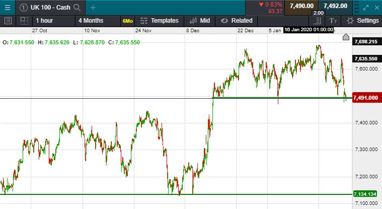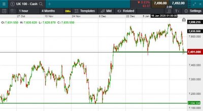UK 100 called to open -100 points at 7490; Deepening fears about the economic and human impact of the deadly coronavirus sent stocks, crude oil and China’s yuan tumbling Monday, and spurred haven assets higher. Futures on Chinese shares fell more than 5% and the yuan erased this month’s trade-deal driven gains in wake of news that the virus continues to spread, with no peak in sight. The Nikkei fell by 2% (483 points) to close at 23,343, however the Hang Seng pared early losses to close the session +40 points at 27,949. The US closed out last week with an all red trading session, led lower by the Dow Jones, dropping 170 points to close at 28,989, the S&P saw a similar percentage fall, giving up 30 points to close at 3,295 and the nasdaq completed the red set, closing at 9,314 (-87 points). Crude oil slipped elow $60 a barrel overnight, whilst traditional safe haven gold rallied to $1578 per troy ounce.