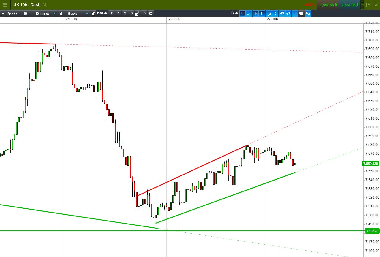UK 100 Index called to open +20pts at 7555, back from yesterday’s 7580 peak, but holding 3-day rising support at 7550. Bulls need a break above shallow falling highs at 7575; Bears require a breach of 7550 (overnight lows, rising support). Watch levels: Bullish 7580, Bearish 7545