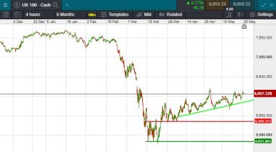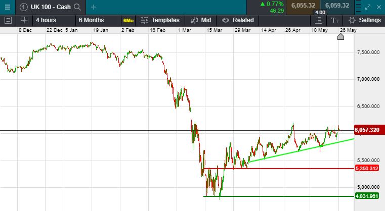 UK 100 called to open +35 points at 6102. Calls for a a positive open come as traders continued to remain positive of a post-pandemic recovery and news that Sentiment has likely been boosted by news overnight that biotech firm Novavax has started human trials of its coronavirus vaccine candidate in Australia. despite brewing geopolitical tensions in the background. US President Donald Trump said late on Tuesday he is preparing to take action against China this week over its effort to impose national security laws on Hong Kong, but gave no further details. Hong Kong shares led declines among major regional indexes, with Hang Seng falling 0.46 percent, though it kept a bit of distance from a two-month low touched on Monday, with mainland Chinese shares down a similar amount. Japan's Nikkei was almost flat.