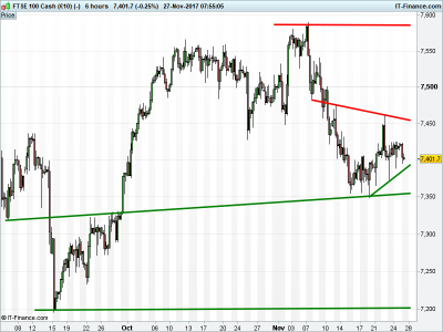 UK 100 Index called to open -5pts at 7405, back from an overnight flirt with the 7425 highs of late last week, but equally holding above 7400 following a brief test, to maintain rising lows support since early last week. Bulls need a break above 7410, Bears a breach of 7395. Watch levels: Bullish 7410, Bearish 7395.