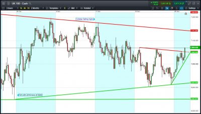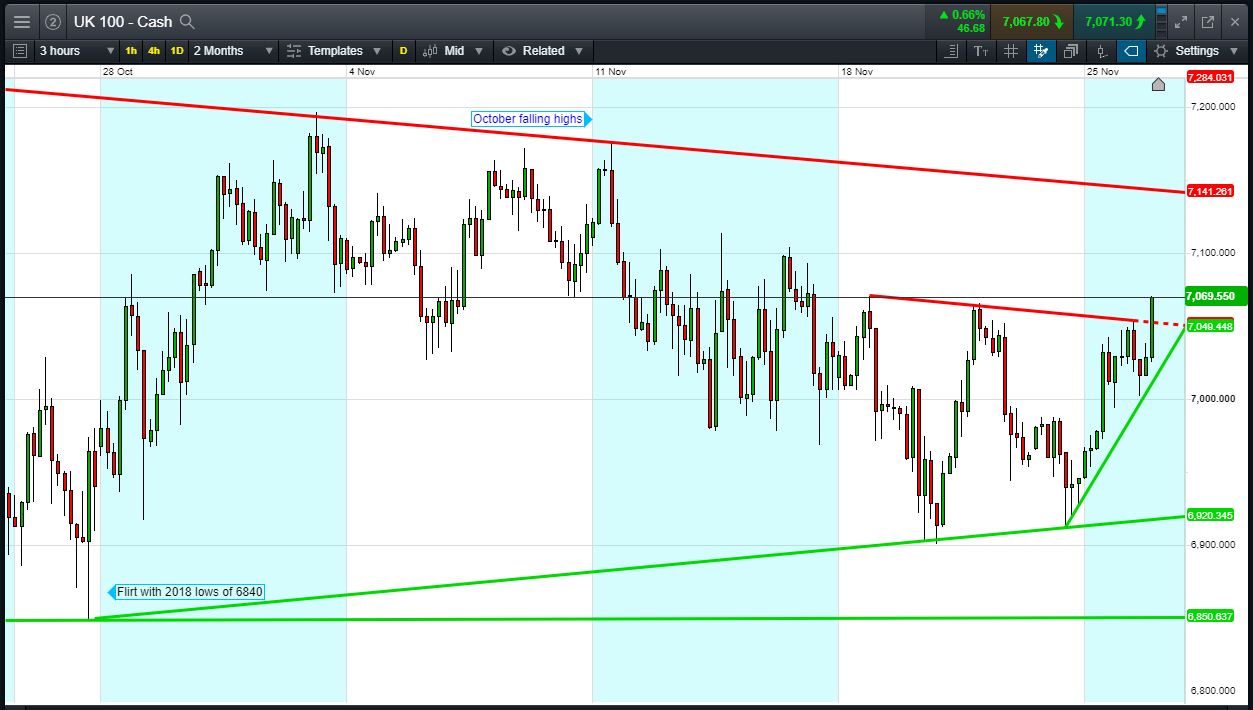 UK 100 Index called to open +40pts 7075, extending an overnight bounce from 7025 to break above 6-day shallow falling highs at 7050. Bulls need a break above 7100 highs before being able to challenge October flailing highs at 7140. Bears require a break back below 7050. Watch levels: Bullish 7100, Bearish 7050
