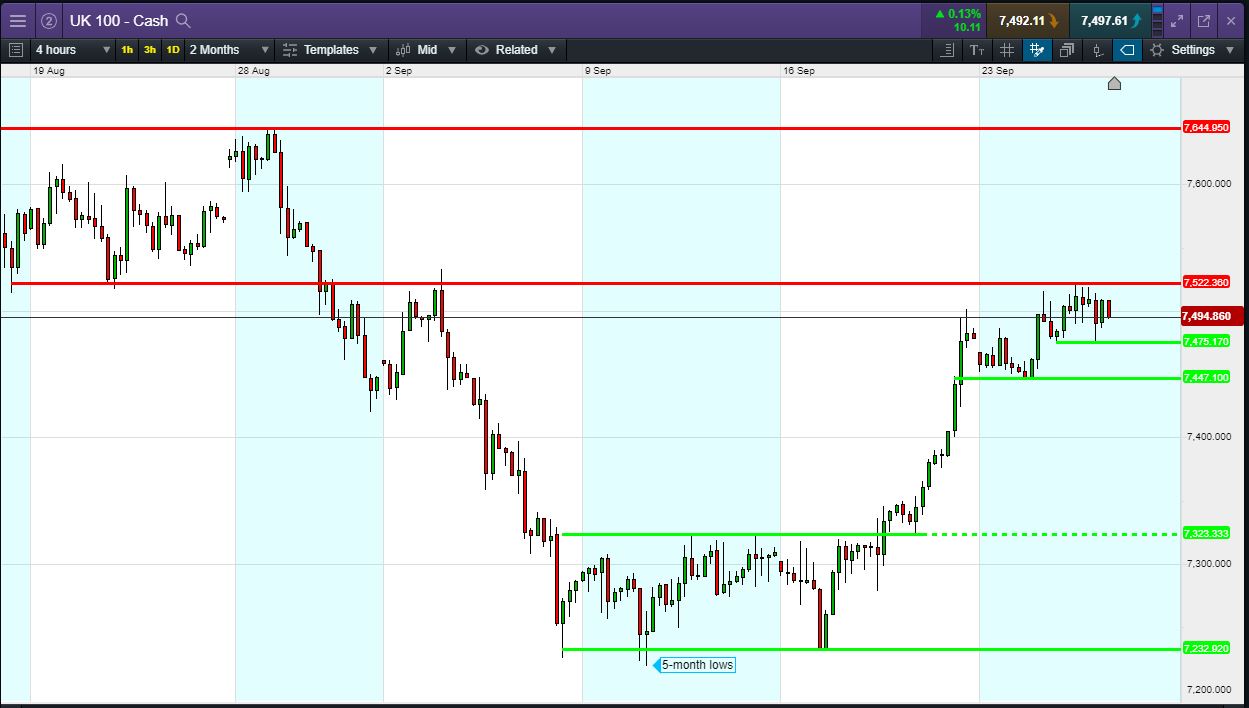 UK 100 Index called to open -20pts at 7490, trading sideways overnight in a 7475-7522 range after breaching 8-day rising support and failing to make a fresh September high. Bulls need a break above 7522 overnight highs to extend the recent recovery rally. Bears require a breach of overnight 7475 overnight lows for more downside. Watch levels: Bullish 7520, Bearish 7475.