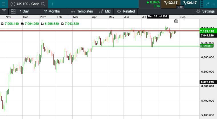 The UK 100 is called to open +10 points today at 7135.  A marginally higher open is expected this morning as traders await news from the Jackson Hole symposium,  US markets had a lacklustre day yesterday with the Dow Jones sliding 192 points to 35,213 and the S&P 500 shedding 26 points to close at 4,470.  In Asia this morning the picture was mixed, Hong Kong’s Hang Seng added 12 points to trade at 25,426, while in Japan, the Nikkei gave up 131 points to sit at 27,612.