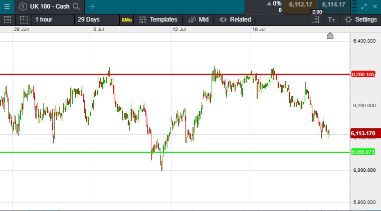 UK 100 called to open +6 points this morning at 6130. The UK 100 is called to open 6 points higher this morning, as company reporting season continues this week and Gold hits record highs. Markets closed in the red on Friday Stateside, the Dow Jones slipped by 182.44 points, or 0.7%, to close at 26,469.89 (Intel contributing to the fall, falling 16.2%, as rival Advanced Micro Devices Inc. shares gained 16.5% , after Intel reported its next generation of semiconductor technology will be delayed and that it may actually use a third party to manufacture it as a contingency plan). The S&P gave up 20.03 points, or 0.6%, closing at 3,215.63; and the Nasdaq fell 98.24 points or 0.9% to close at 10,363.18. Declines were driven by investors fretted about rising Sino-American tensions and a lack of progress on another fiscal stimulus bill in Washington.