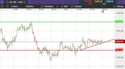 The UK 100 called to open -9 points at 7,479. The UK 100 is expected to open lower when trading for the week gets underway on Monday following losses in Asia, the Nikkei fell 0.5%, while the Shanghai Composite was 0.3% lower in late trade, and the Hang Seng was also 0.3% lower. On Friday it was a mixed return for Wall Street after the thanksgiving holiday, The Dow rose 117.12 points, or 0.33%, to 35,390.15. Meanwhile, the S&P ticked higher by 0.06% to end at 4,559.34. However the Nasdaq fell 0.11%, closing at 14,250.85.