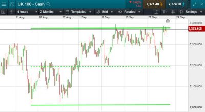 UK 100 called to open +20 points at 7371; This welcome green open comes on the back of an under pressure trading session in Asia, political tensions in the US fed through to mute sentiment, with risk off sentiment very much the order of the day, seeing the Nikkei giving up 1.3% during trading. Stateside it was a similar story after Donald Trump lashed out a “whistleblower” whose complaint is fuelling a congressional impeachment probe and suggested that passing along allegations that he committed wrongdoing was tantamount to treason. However on a positive note the Dow did recover almost 100 points from its bottom to closing value. Crude oil bounced from the $61 level seen yesterday to settle at $62.3. Whilst gold held firm at $1505, could this be a sign however that risk On sentiment is still in full flow, despite geopolitical tensions running high, the traditional safe haven has barely moved?