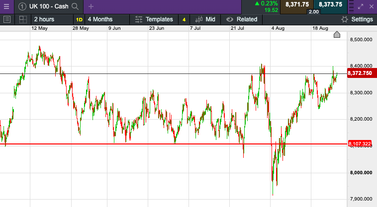 The UK 100 called to open +30 points at 8,375.  The UK 100 looks set to open higher again this morning.