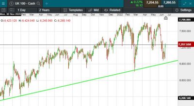 The UK 100 is called to open +42 points this morning at 7315. Economic concerns are still dragging on equities, but oil companies are expected to pull the index higher after jawboning at the G7 revealed little prospect for crude prices to come down soon. Wall Street finished in the red yesterday with a 0.3% decline for the S&P and a 0.2% drop for the Dow Jones.