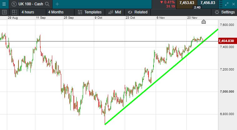 The UK 100 is called to open -28 points this morning at 7458. The UK 100 looks set to open lower this morning following anti-lockdown protests across several major cities in China which helped send Asian markets lower as a result, the Shanghai Composite was down 0.9%, while the Hang Seng index in Hong Kong was down 1.8%. On Friday, the Dow rose 152.97 points, or 0.45% to 34,347.03, marking the third consecutive session of gains. The S&P fell 0.03% to end the day at 4,026.12. The Nasdaq slipped 0.52% to 11,226.36.