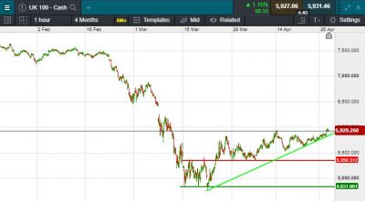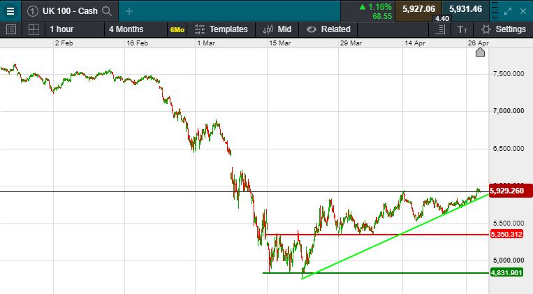 UK 100 called to open +12 points points at 5970. This is on the back of a day of positive sentiment yesterday, this was partly driven by renewed hopes of an easing of lockdown, however, Britons are being urged to stick with it and told it has helped slow deaths from coronavirus, as the government plans safe ways to reboot the battered U.K. economy and gradually ease restrictions. The government won’t alter social-distancing measures until it is clear that doing so won’t trigger a second wave of infections. Earnings season is in full swing, in the US Alphabet, Google's parent company revenues topped estimates, though ad sales slowed sharply in March. Ford said it may lose more than $5 billion in the second quarter, it may be the case that investors see past these quarterly results and look to the future, if BP & HSBC results from yesterday are anything to go by. Oil climbed after losing more than a quarter of its value over the past two days with volatility likely to continue on concern prices may drop below zero again as investors and a major fund exit the June contract. Futures added 14% in New York after dropping Tuesday as S&P Global Inc.