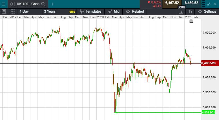 UK 100 called to open -55 points this morning at 6470Calls for a negative open today come on the back of a positive session in the US yesterday, with European markets instead seemingly taking a lead from Asia.  Once again focus yesterday was back on the hot topic of global markets at the moment the reddit boys taking on the big hedge funds.  American airlines was the latest share to be pushed higher, which spiked 31% at one point during trading yesterday. The Dow Jones traded 300 points to close at 30,603, while the S&P 500 added 37 points to 3,787.  The tech-heavy Nasdaq was weighed down by some of its tech heavyweights, Apple and Tesla both retreated after Wednesday night trading updates, looked less sprightly in comparison, however still manged to eek out a gain of 66 points to close at 13,337.  It was a less positive session in Asia overnight, Japan’s Nikkei 225 dropped 1.89% while the Shanghai composite in China slipped 1.62%, and in Hong Kong, the Hang Seng index dipped 0.92%.