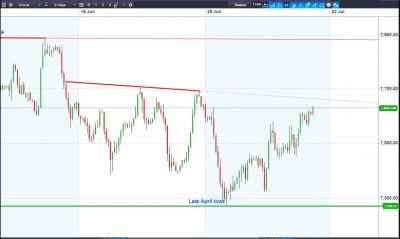 UK 100 Index called to open +50pts at 7665, extending Monday’s rebound from April lows towards mid-June falling highs resistance. Bulls need a break above falling highs at 7682; Bears likely require a breach of 7630 rising support and overnight lows. Watch levels: Bullish 7682, Bearish 7630