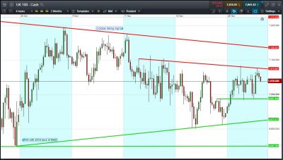 UK 100 Index called to open +35pts 7040, adding to the rally from last Friday, although already off its 7075 highs after encountering shallow falling resistance from mid-month. Bulls need a break above 7050 for another challenge of 7075. Bears require a breach of 7030 resistance-turned-support if they are to worry the 7000 zone again. Watch levels: Bullish 7075, Bearish 7030