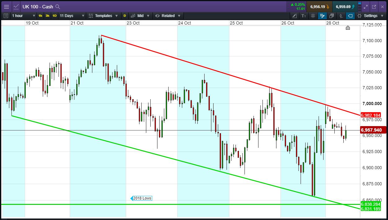 UK 100 Index called to open +15pts at 6955, with an overnight sell-off from 7000 keeping it in a 1-week falling channel towards 2018 lows of 6838, which it flirted with on Friday afternoon. Bulls need a breakout above the falling highs resistance trendline at 6982. Bears require a breach of 6935 overnight lows to extend the overnight pullback. Watch levels: Bullish 6982, Bearish 6935