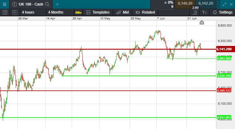 UK 100 called to open -20 points this morning at 6139.  Overnight trading in Asia saw a continuation of Friday's sentiment which saw global markets recent rally somewhat stall as Coronavirus cases in the US spiked to new record highs, this saw the Dow Jones sink back below 25,000.  The UK 100 index sits around previously identified support level, will it break below this today? or continued to find support and show further resilience as the UK prepares for bars, pubs and restaurants to reopen at the end of this week, following on from retails in mind June.  Brent crude trades at $40.15 a barrel, down 87 cents, whilst traditional safe haven gold trades at $1,787.90 an ounce, up $7.80