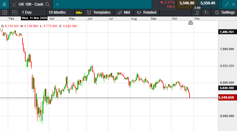 UK 100 called to open -36 points this morning at 5555.  Calls for a negative open com on the back of the UK 100 hitting its lowest levels for 6 months yesterday as investors reacted to surging rates of infections. Overnight falls in Asian markets were less pronounced on Thursday, however, as the COVID-19 pandemic there is seen more under control, with Hong Kong’s Hang Seng index down 0.6%, and Japan’s Nikkei 225 index off 0.4%.  Yesterday Stateside the Dow Jones Industrials Average plunged 943 points, or 3.4%, the biggest one day fall since June to close at 26,519, while the S&P 500 index fell by 3.5%, and the tech heavy Nasdaq dropped by 3.7% with a shedload of key US tech results due after-hours on Thursday.