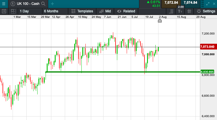 The UK 100 is called to open +43 points today at 7075.  The UK bluechip index looks set to open August brighter this morning, as risk sentiment appears to have potentially swung after a difficult end to last week, if Asian markets are anything to go by.  In Japan the Nikkei 225 jumped 1.97% this morning, on mainland China markets recovered from an earlier slip, with the Shanghai composite up 1.5% and the Shenzhen component advancing 1.439%.  Hong Kong’s Hang Seng index was 0.92% higher.