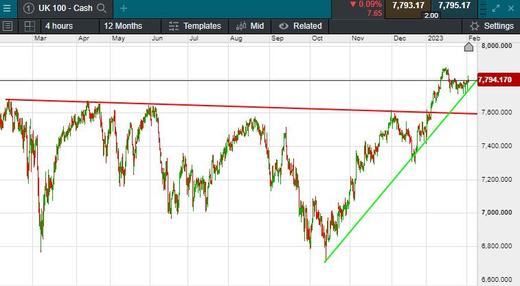 The UK 100 called to open +34 points at 7795. The UK 100 looks set to make a strong start to the day as the Federal Reserve slowed the pace of interest rate increases and the Fed chairman, Jerome Powell, stated "the disinflationary process has started.” On Wall Street US markets took heart from the slower pace of rate rises and the Dow which had been down over 300 points earlier in the session, closed in positive territory, up 7 points, the Nasdaq Composite added 232 points, 2%, to close at 11,816, while the S&P improved by 43 points or 1.1%, to trade at 4,119. Focus will now switch to interest rates decisions today from the Bank of England and the European Central Bank.