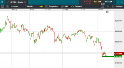 UK 100 called to open flat this morning at 5577.   Calls for a flat open this morning come as reality over fresh lockdown measures in the UK hit investors.  Overnight in Asia were mostly higher today after a private survey showed that China’s manufacturing sector expanded for the sixth straight month in October.  China’s Shanghai Composite was up 0.08% while Hong Kong’s Hang Seng index edged higher by 1.13%.  Shares in Japan led gains with a 1.51% rise.