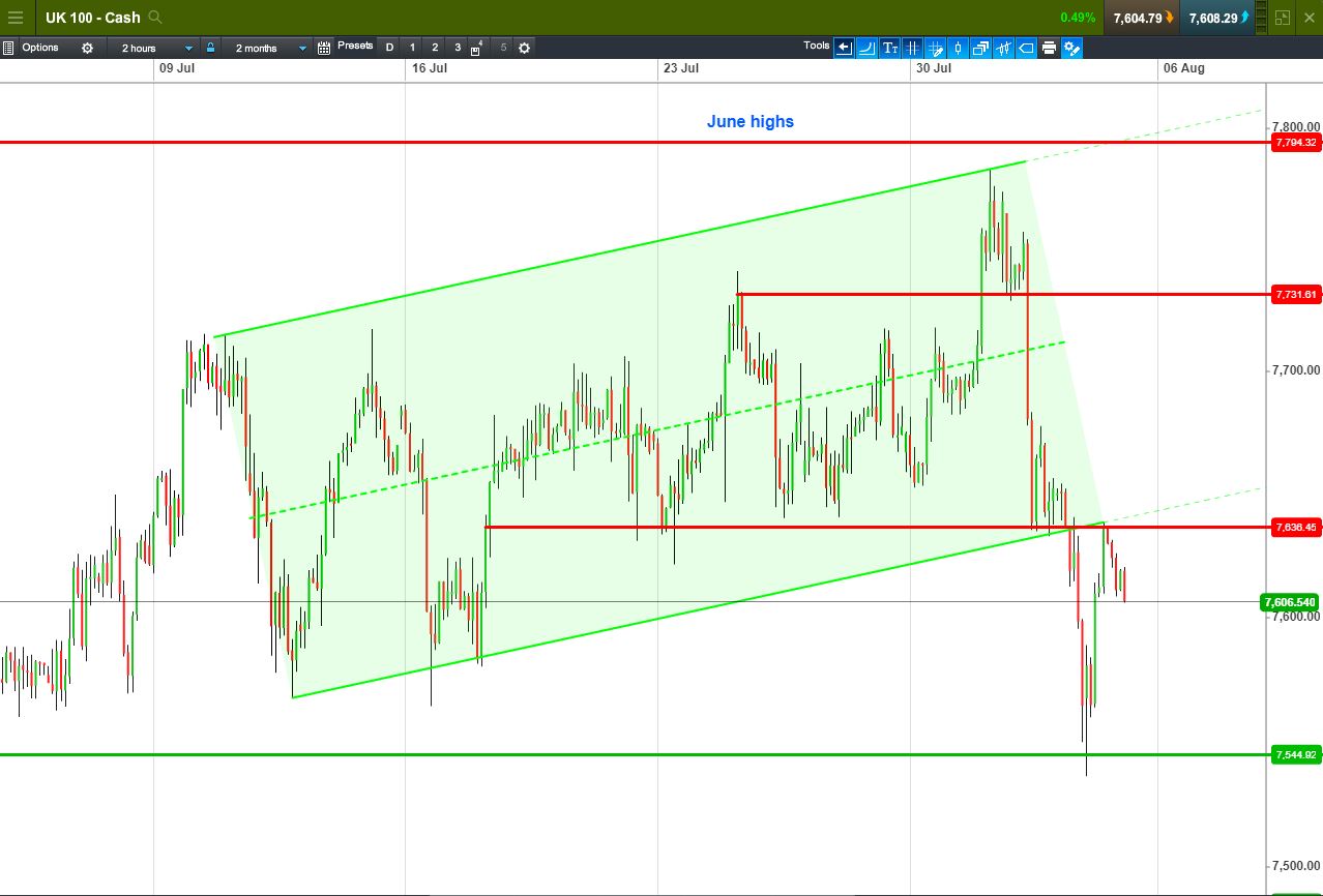 UK 100 Index called to open +30pts at 7605, holding yesterday’s rebound from 7535 lows but with 7640 turning resistance overnight after yesterday’s breach of recent support and the floor of a multi-week up-channel. Bulls need a break above 7640 to regain the channel. Bears require a breach of 7608 overnight lows to revisit yesterday’s lows. Watch levels: Bullish 7640, Bearish 7610