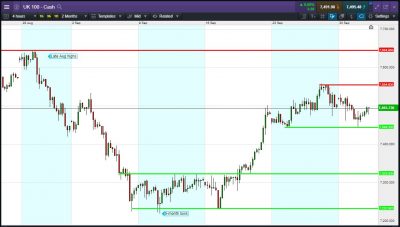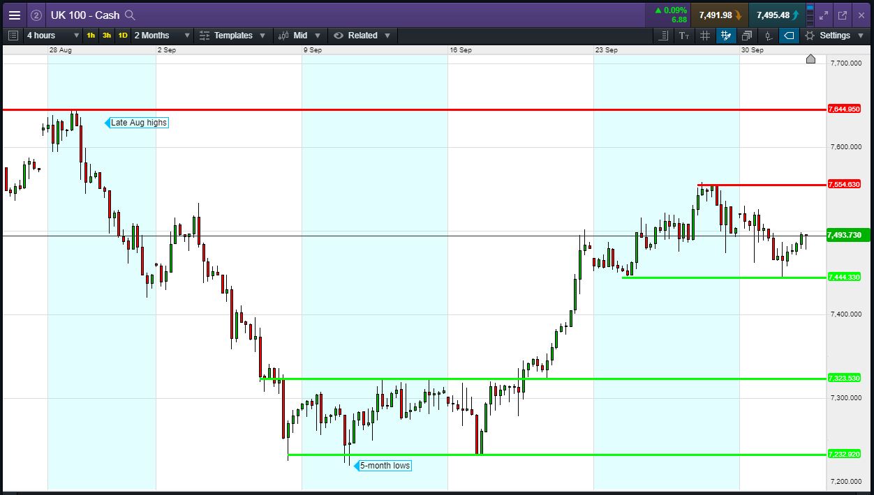 UK 100 Index called to open +20pts at 7492, extending its rebound from yesterday’s 25 Sept lows of 7444. Bulls likely need a break above 7500 to clear overnight highs and inspire confidence in a rebound towards recent 7555 highs. Bears require a breach of 7475 for another visit of yesterday’s lows. Watch levels: Bullish 7500, Bearish 7475
