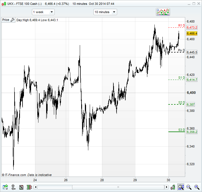 UK 100 Index called to open +5pts at 6455, after the US closed with small losses amid much volatility following the US Fed’s monetary policy update which saw an end to QE3, as expected, but included a marked hawkish change in language regarding the labour market (upbeat), suggesting an eye on an eventual first interest rate rise.