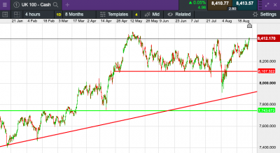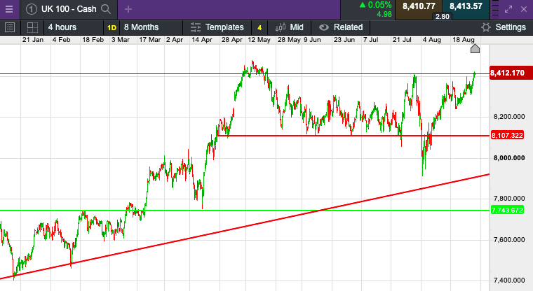 The UK 100 called to open +32 points at 8,411. The UK 100 looks set to open above 8400 today following on from yesterdays gains.