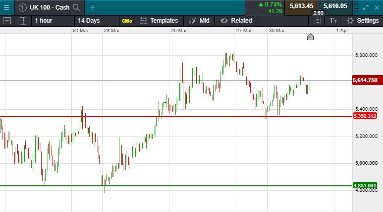 UK 100 called to open +50 points at 5613. This comes on the back of Donald Trump and Vladimir Putin agreed to hold discussions with energy officials from their countries to stabilise oil prices. China's official PMIs rebounded in March from record lows, showing economies can recover if citizens comply with stay-at-home policies long enough to smother the outbreak. It was a mixed session in Asia seeing the Nikkei closing down 0.88%, the Hang Seng however rose by 239 points to close the day 1% higher at 23,415 and in China there was also gains, albeit them more modest, rising by 0.5% to close at 2,692. Oil prices have indeed stabilised, trading above yesterdays 18 year lows, to trade at $23.13 per barrel (Crude)