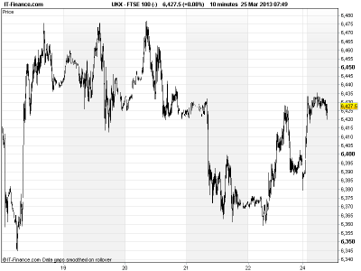 UK 100 down off its lows of late on prospect of a Cyprus deal. Highs of Thursday (6435) still need to be cleared before resistance of early last week around 6480 can be tested. Long-term 3-month uptrend still intact with support (6350).