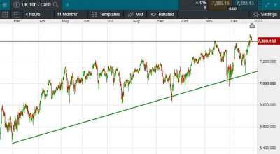 The UK 100 is called to open -30 points today at 7370. The UK 100 looks set to open slightly lower this morning to end out 2021, on what is a shorter trading day. On Wall Street yesterday all three of the major averages faded into the close in regular trading Thursday, after trading slightly higher throughout the rest of the session. The Dow shed about 90 points, or 0.3%, to snap a six-day win streak. The S&P 500 dipped 0.3%, falling less than 1% from its record, which it hit in the previous session. And the Nasdaq Composite lost 0.2%. In Asia this morning, markets were mixed, Hong Kong’s Hang Seng index jumped 1.2% in New Year’s Eve trading and the Shanghai Composite index gained 0.4%. Sydney’s S&P/ASX 200 lost 0.8% as the number of new coronavirus cases surged.