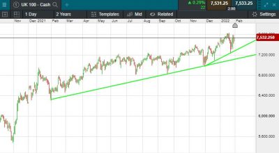 The UK 100 is called to open +67 points today at 7533. The UK 100 looks set to swing higher this morning after Friday’s 83-point decline. Stocks were mostly higher in Asia this morning, mainland China and South Korean markets remained closed for the Lunar New Year eve, Japan’s Nikkei and Hong Kong’s Hang Seng indices however both gained more than 1%. It was a bumper session on Wall Street Friday, The Dow Jones rose 564.69 points, or 1.7%, to 34,725.47. The blue-chip average posted its best day since Dec. 6 after being down more than 350 points at its lows. The S&P added 2.4% to close at 4,431.85 — its best session since June 2020. The Nasdaq rallied 3.1% to 13,770.57. Overnight the cost of a barrel of crude breached $91 for the first time since 2014.