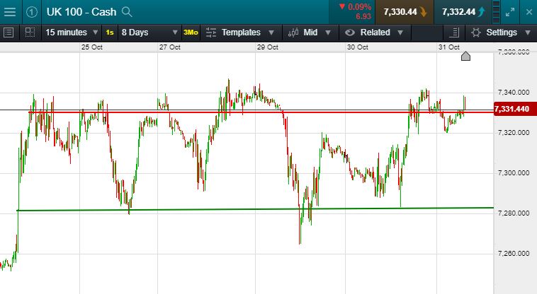 UK 100 called to open flat at 7330 this morning; this comes after the Fed cut interest rates in the US for a third consecutive quarter. Also significant was the more dovish tones for the rest of 2019. Reporting season continued with big name tech stocks Facebook, Apple and Samsung amongst those surpassing expectations. Overnight trading in Asia showed signs of further positive sentiment, the Nikkei closing +94 points and the Hang Seng +231 points. However Chinese factory activity shrunk at a sharper pace than expectation. As to be expected the Dow Jones closed +115 points, leading both the S&P and the Nasdaq higher. Oil slipped below $61 a barrel once more overnight to settle at $60.5. Whilst gold once more tested the $1500 handle, sitting just $2 shy.