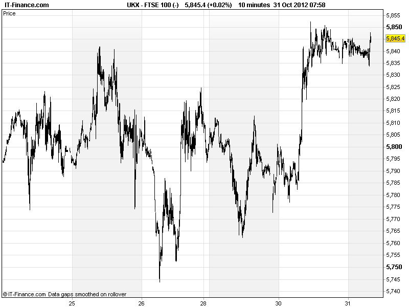 UK 100 called to open +5pts, with Asian markets boosted by improved sentiment in Europe (Italian debt auction; Spanish GDP; earnings reports; Greece nearly there?) and a good run of macro data overnight. US markets were still closed last night after Hurricane Sandy, but are expected to reopen today (some macro data/earnings delayed).