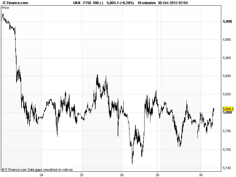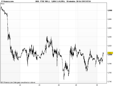 UK 100 called to open +5pts, with Asian markets weak amid on-going Eurozone concerns (Greece and Spain as usual with uncertainty about receipt of more help for the former and request for help for the latter) and US disruption (markets still closed, widespread power outages and flooding) as Hurricane Sandy makes landfall (watch the insurance sector as damage estimates begin).