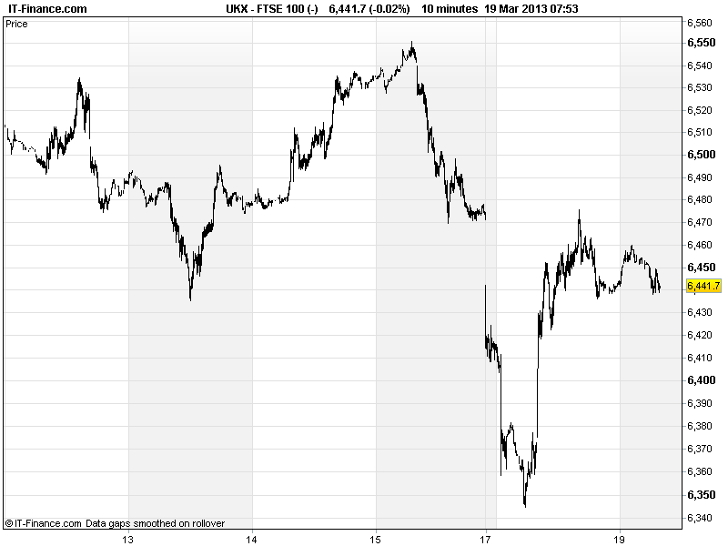 UK 100 called to open -25pts despite a rebound by Asian markets, with continued uncertainty surrounding the Cyprus bank deposit levy dominating the newsflow and a delayed parliamentary vote on the extreme measure now scheduled for 4pm today. Until a vote, Eurozone debt crisis showing political stalemate in both Cyprus and Italy.