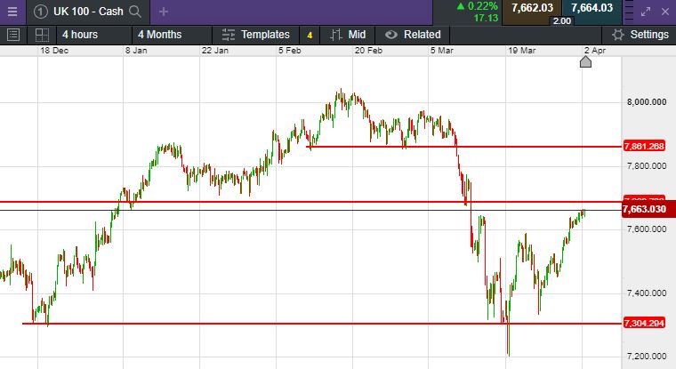 The UK 100 called to open +34 points at 7665. The UK 100 looks set to start the week on the front foot despite a new survey which showed growth in the Chinese manufacturing sector came to a halt in March. Brent crude futures surged about 7% to above US$85, hitting its strongest levels in a month after OPEC+ announced a surprise production cut of more than 1 million barrels a day. Stocks in the US closed sharply higher on Friday with the Dow Jones up 1.3%, the S&P 500 up 1.4% and the Nasdaq Composite up 1.7%. In Asia this morning, the Nikkei 225 index in Tokyo was up 0.5%. In China, the Shanghai Composite rose 0.6%, while the Hang Seng index in Hong Kong slipped 0.5%.